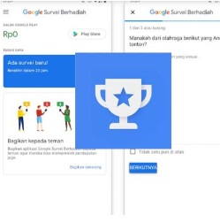 Aplikasi-aplikasi yang dilucurkan ole google juga turut memberikan hadiah atau berupa bonus kepada para penggunanya. Salah satu yaitu aplikasi yang memberikan keuntungan bagi para penggunanya adalah google survei berhadiah ini. Pengguna yang menggunakan aplikasi google survey berhadiah ini akan diminta untuk menjawab survei dan natinya akan mendapatkan saldo google play.