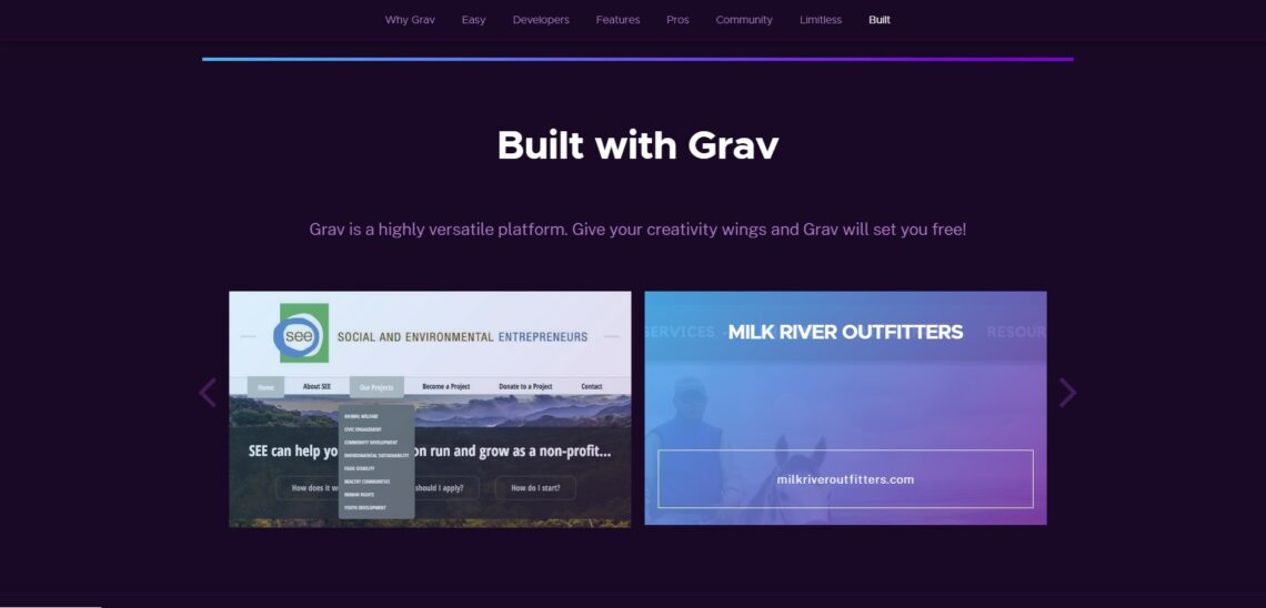 Grav merupakan flat sebuah CMS yang dibangun dengan menggunakan sistem open-source, lebih cepat dan juga sangat fleksibel. Grav juga dibuat tanpa menggunakan MySql database, mengusung pada teknologi flat file. Ini menjadi pembeda dengan WordPress, Grav tidak menggunakan database. Sedangkan WordPress masih meggunakan database. Keuntungan dari Grav dapat lebih cepat dan juga arsitektur sistenyang lebih sederhana.