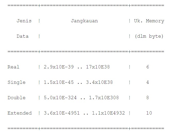 2. Real adalah bilangan pecahan yang menggunakan angka desimal. Tipe data ini dikenal dengan float atau floating point. Contoh seperti gambar di bawah ini: