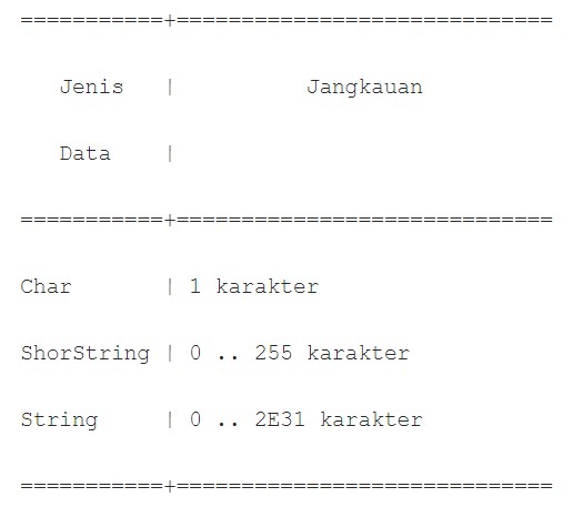 3. String tipe data ini sering digunakan di dalam bahasa pemrograman. String ini adalah tipe data yang terdiri dari gabungan antara huruf, angka, dan berbagai karakter lainyya. Bila panjang suatu string di dalam deklarasi tidak disebutkan, maka panjang maksimum mengikuti nilai dari jenis data tersebut. Berikut ini Contohnya :