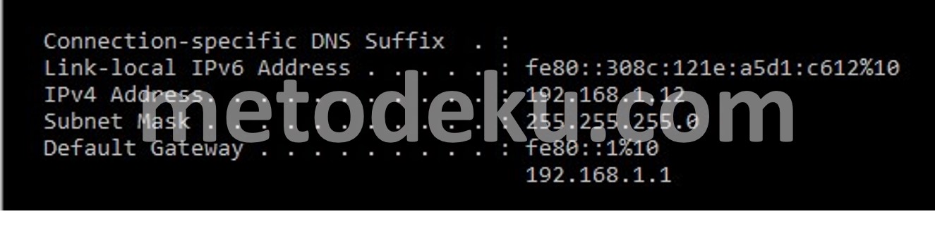 Setelah dicommand prompt, tulis ipconfig. command prompt akan memberi info IP Configuration. Ada beberapa info seperti default gateway dan lain-lain juga akan diperlihatkan opsinya. Pada IPv4 itu menandakan IP dari perangkat atau laptop anda. Dan untuk Default Gateway tertera angka 192.168.1.1 itulah IP dari wifi yang tersambung oleh perangkat anda.