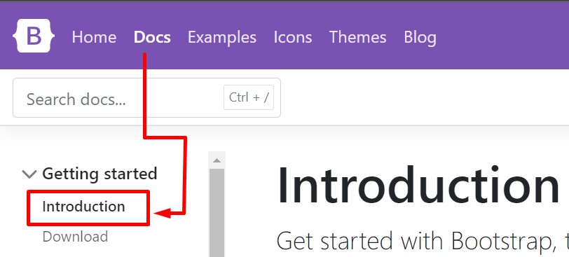 - Buka website resmi Bootstrap di gogle lalu pencet tulisan samping pojok kiri atas yaitu Introduction.