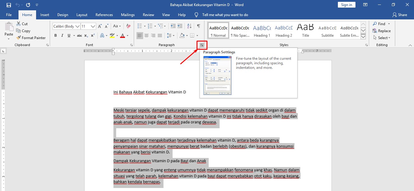 3. Klik icon kecil yang ada di samping kanan pada grup paragraf.