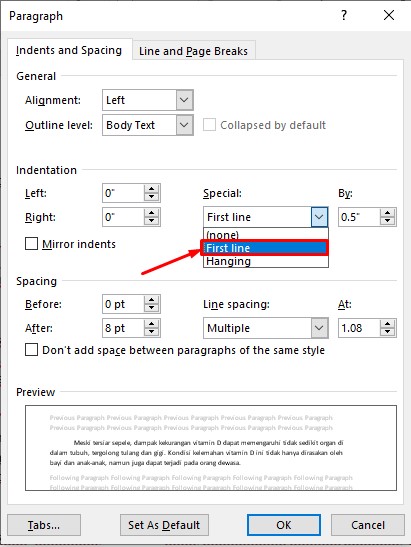 4. Sesudah di klik, akan muncul pop up yang bisa untuk mengatur paragraf. cara membuat paragraf dengan cara otomatis, atur dulu opsi special dan pilih “First line”.