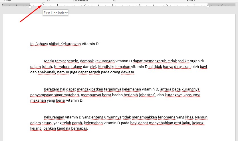 6. Sampai langkah ini, kalian akan berhasil untuk mengatur paragraf dengan cara otomatis. Tetapi, bila kalian merasa letak suatu huruf awal di tiap alinea kurang tepat, blok semua paragraf dan klik di icon panah di rule Microsoft word.