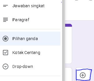 Klik tombol “+” untuk menambahkan pertanyaan baru. Pilih “Pilihan Ganda” dari opsi pertanyaan yang muncul.