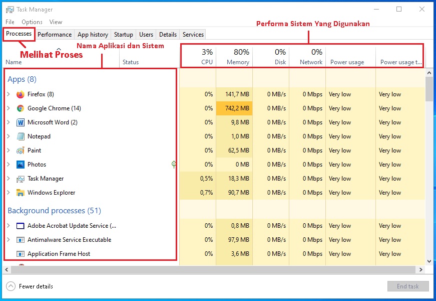 Daftar aplikasi yang sedang berjalan dan proses background yang berjalan di CPU, memory, disk, jaringan, GPU, juga informasi pemanfaatan sumber daya lainnya.