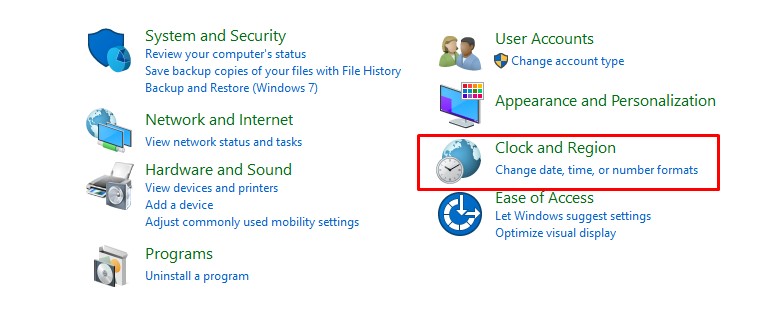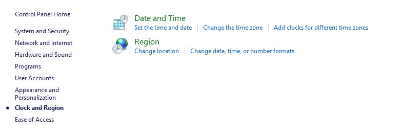 Clock, Language, and Region ini berfungsi untuk mengatur hal hal yang berkaitan dengan jam, Bahasa, wilayah, mata uang, dll. Bagian ini memiliki kategori sebagai berikut :