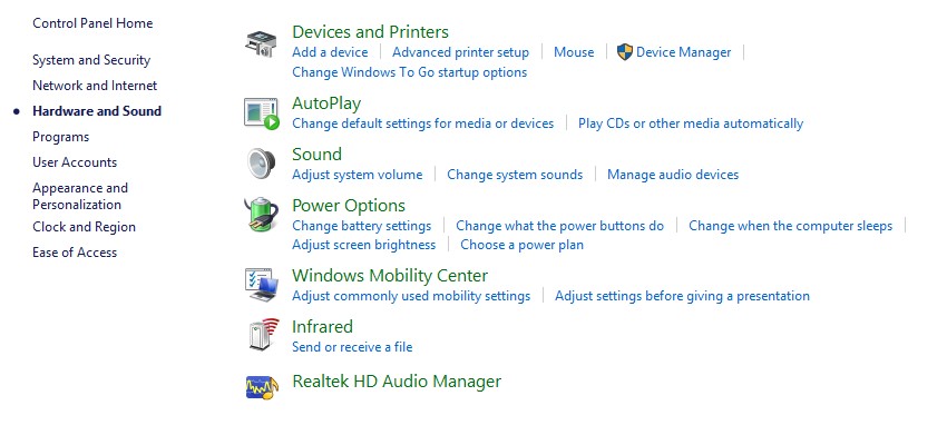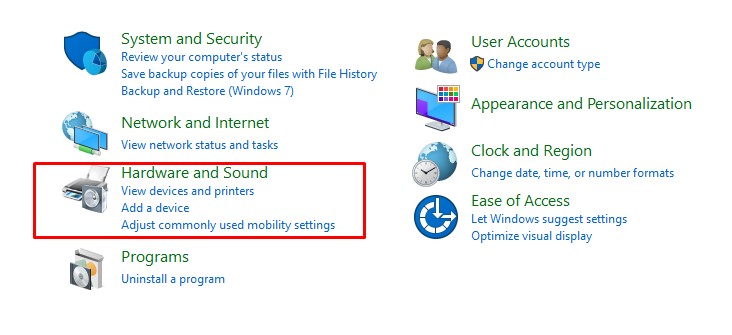 Hardware and Sound berfungsi untuk melakukan pengaturan perangkat hardware pada computer. Hardware seperti printer, alat suara, hingga pengaturan perubahan suara bisa diatur disini. Bagian ini memiliki kategori sebagai berikut :