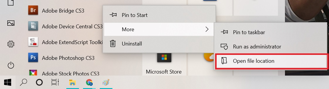 - Setelah itu ketik nama aplikasi yang ingin ditampilkan di desktop, misal Photoshop. Kemudian klik kanan More > dan pilih Open file location.