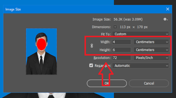 - Maka akan keluar tampilan menu Image Size seperti ini, dan disini kalian hanya perlu mengubah Width Heightnya menjadi Centimeters dan mengubahnya menjadi 4×6 seperti gambar dibawah. Lalu klik OK.